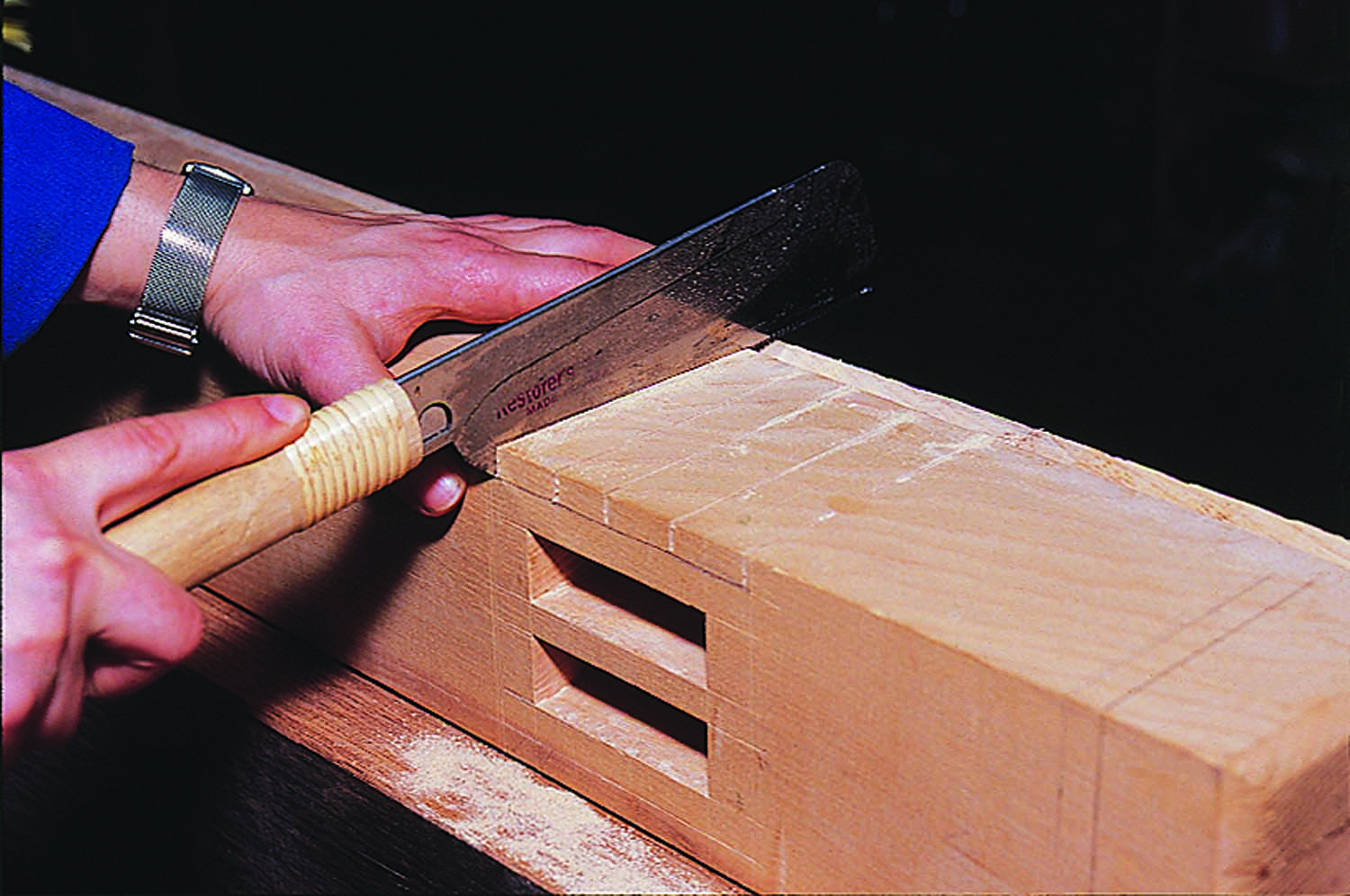 Test your skills. Sawing the tenons from the leg with a Japanese rip saw requires a sharp saw, a steady hand and a good eye.