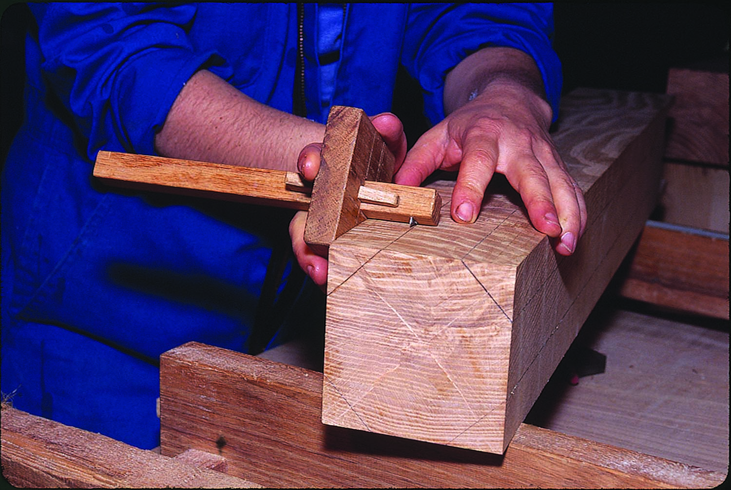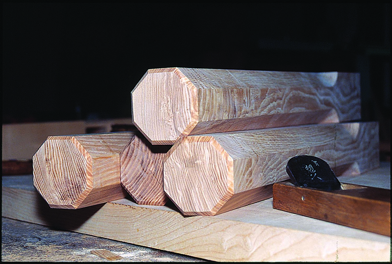 She chose an octagon for the leg shape. Out of hard cardboard, Laure made an octagonal template then traced it onto the bottom end of the legs. She used a marking gauge to draw the line up the face of the leg until it was 21⁄2” below the beam line. There she drew lamb’s tongues to not disturb the tenons.