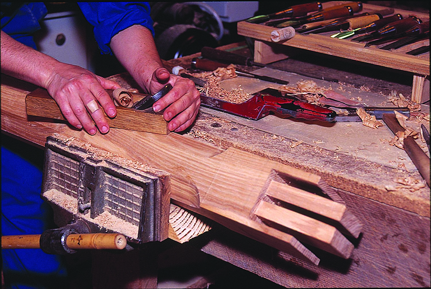 Finesse the final surface. A drawknife, chisels and a handplane are used to cleanly finish the octagonal shaped legs, including the lamb’s tongue.
