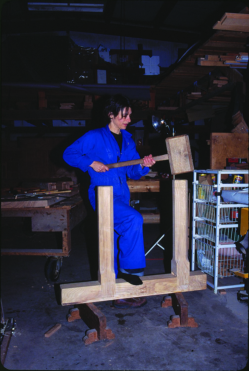 Table leg smackdown. To handle the stresses of use, the mortise-and-tenon joinery has to fit tight. Here the legs are persuaded using the pounding commander.