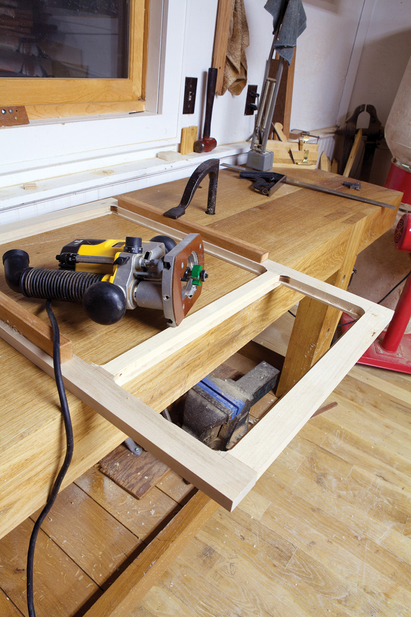 After the glue dries, rout a 12“-deep x 38“-wide rabbet on all four edges of each opening, and square the corners with a chisel.