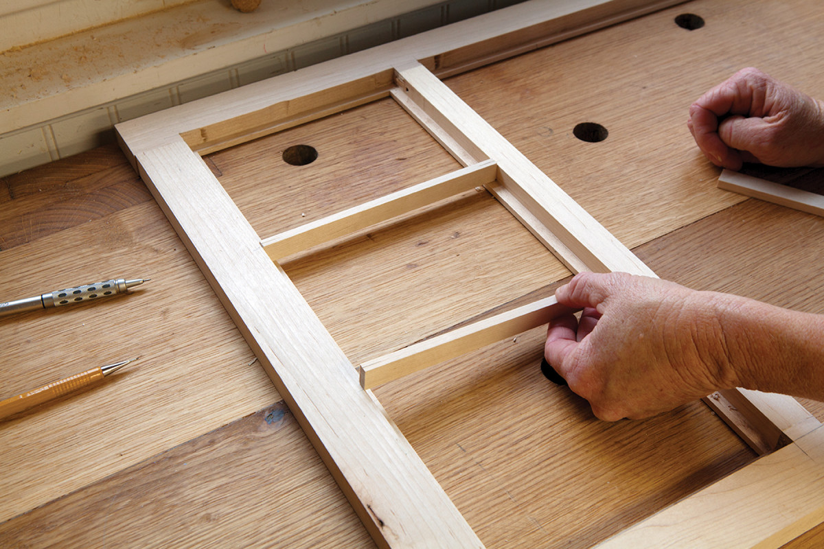 Now dry-fit the muntins behind the back bars and shift things as needed to get three equal-sized openings. Mark that location on the top and bottom of the opening so you can easily line up the centerline on the back bars.