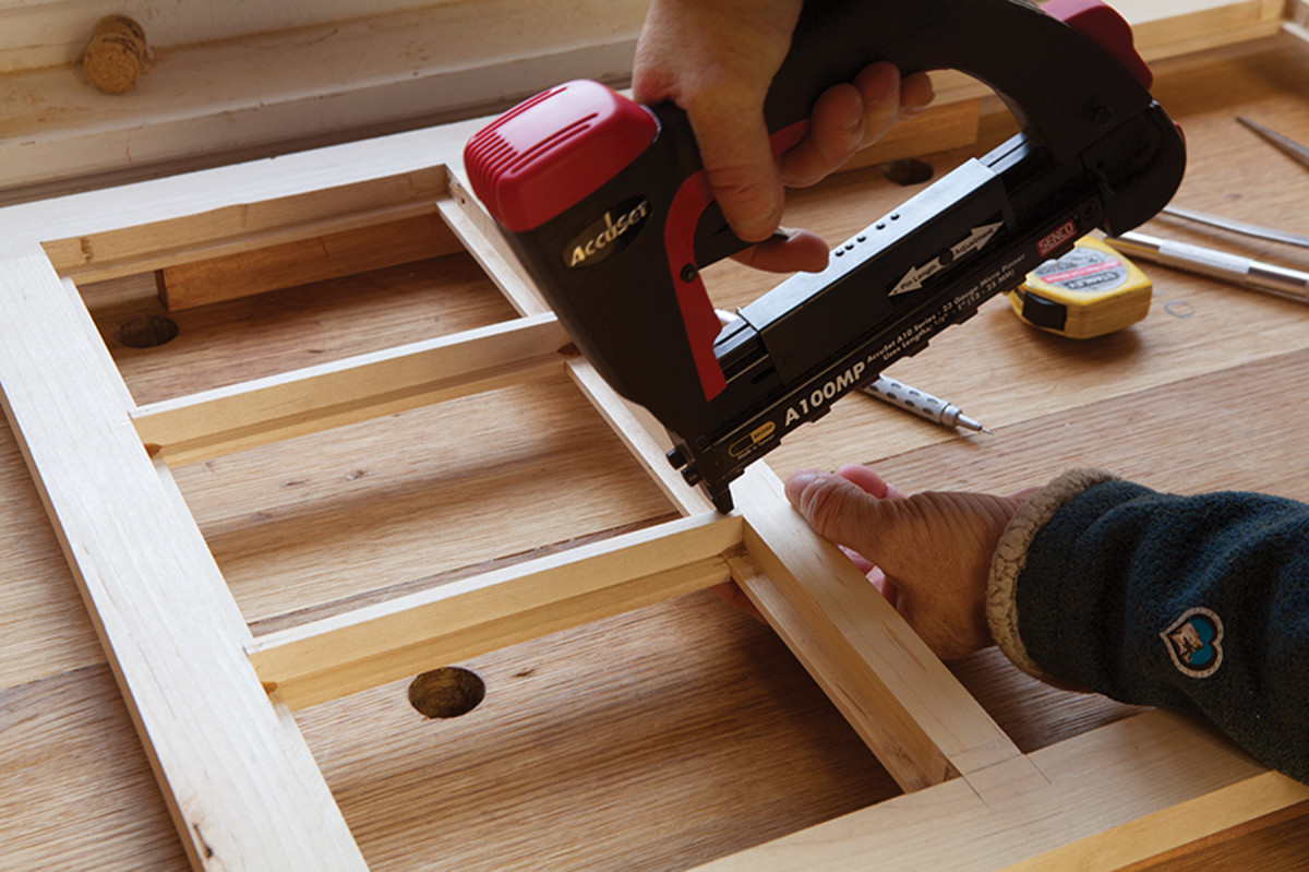 Pin it. Put a dab of glue in the rabbet, then pin the strips in place. Note: I’m merely holding the muntin in place here with my fingers.