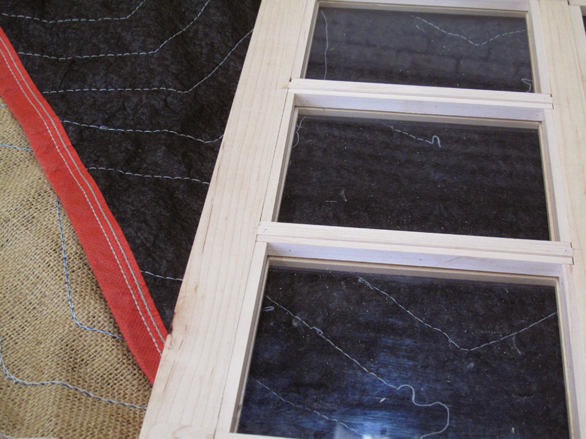 Both the mirror and the three clear glass panels are 18” thick (I had them cut at a local glass and paint store), and are housed in 12“-deep x 38“-wide rabbets. So that means you’ll need glazing strips no more than 38” x 38“. And while it doesn’t matter a great deal on the mirrored glass because they won’t show through, for the clear glass you’ll want to make sure no strip peeks into the opening – so check that before you pin them in place.