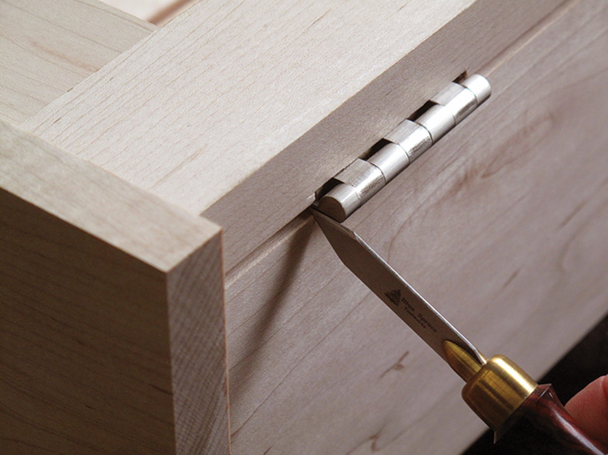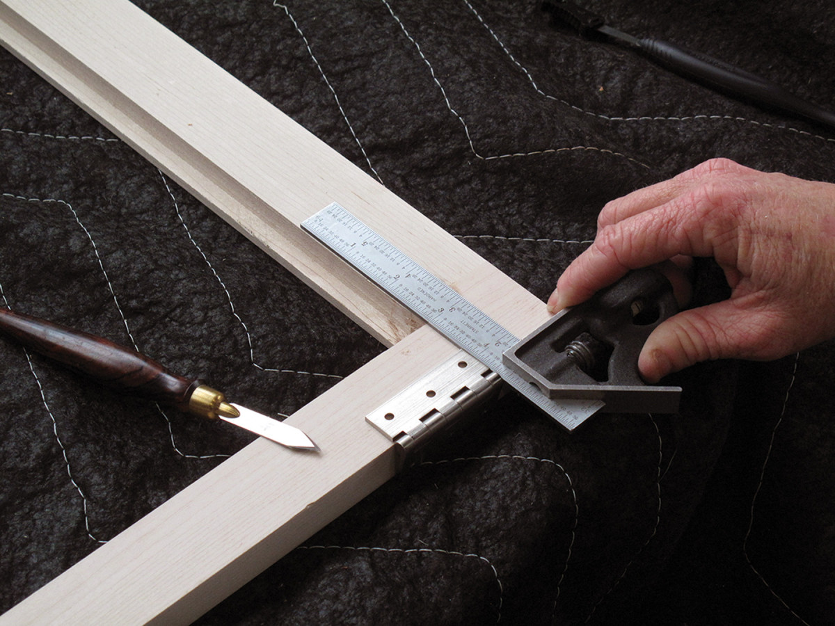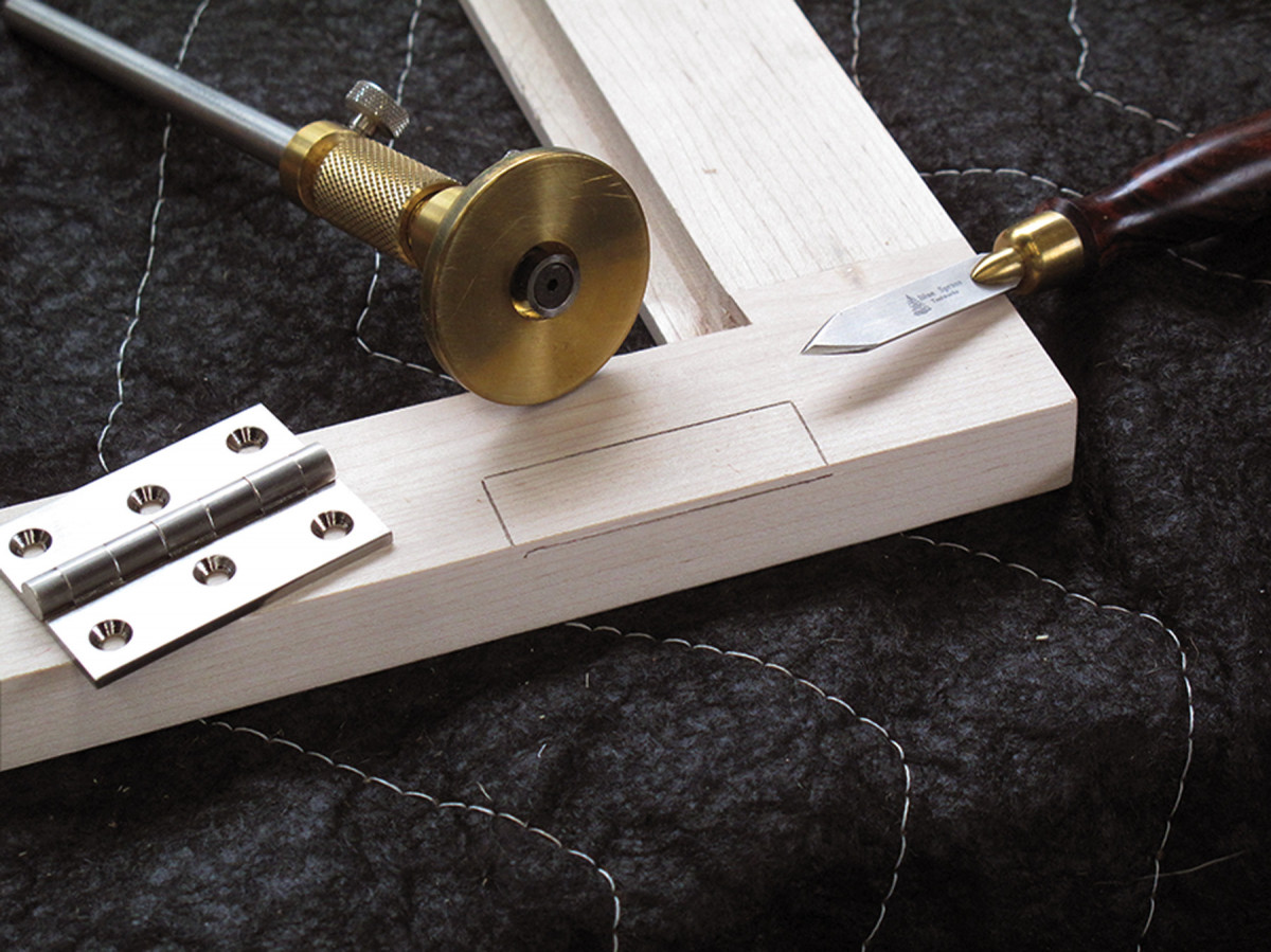 2. Mark. Hold the hinge firmly in place with your off hand, and use a marking knife to score around the edges. A series of light cuts will be more effective than one deep cut. Now set a cutting gauge to the exact thickness of the leaf and mark the mortise depth. (I’ve penciled in the lines here for ease of viewing.)