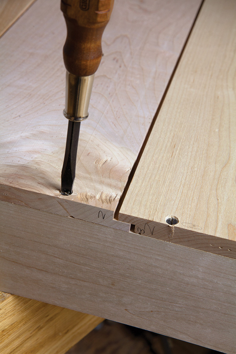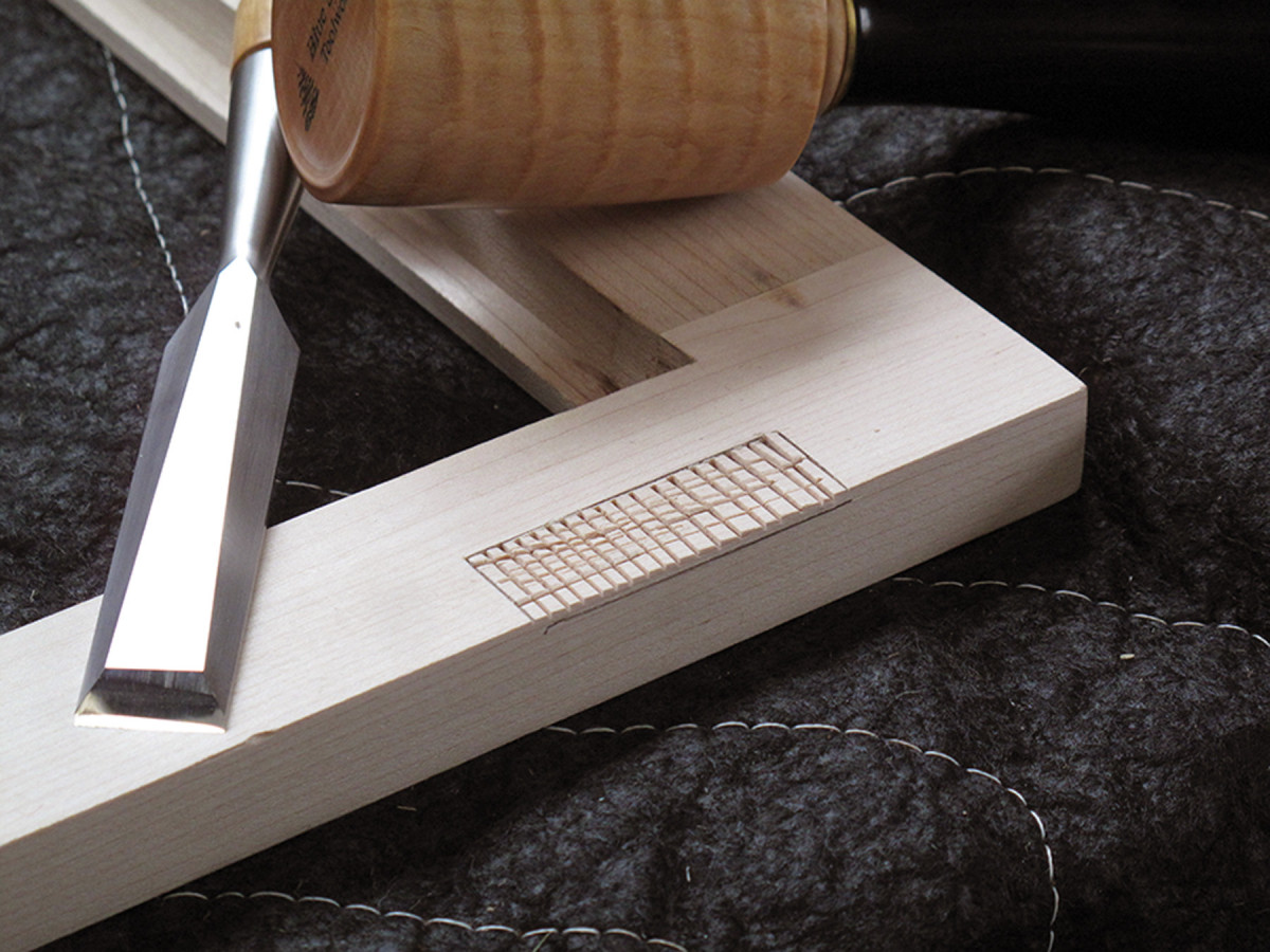 3. Chop. Make a series of cuts in the waste with a chisel, and use the tool to deepen the edges you marked with your knife (bevel facing into the waste, of course).