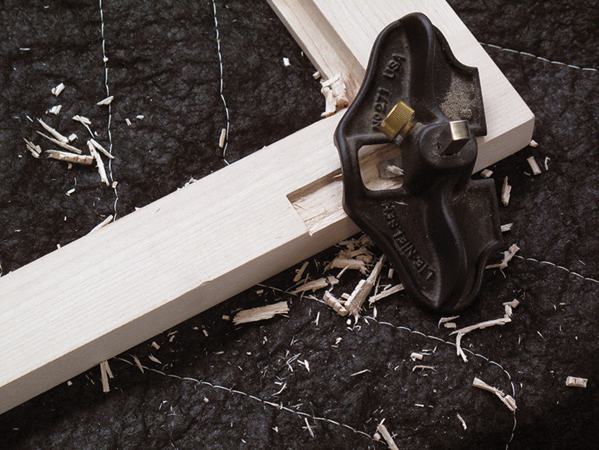 4. Clean. Drop the router plane blade in the baseline then tighten it. A few passes with the plane will lift out the waste and smooth the bottom of the mortise. (You can also set the router plane to the thickness of the hinge leaf, and use the plane to mark the bottom of the mortise, instead of a cutting gauge.)