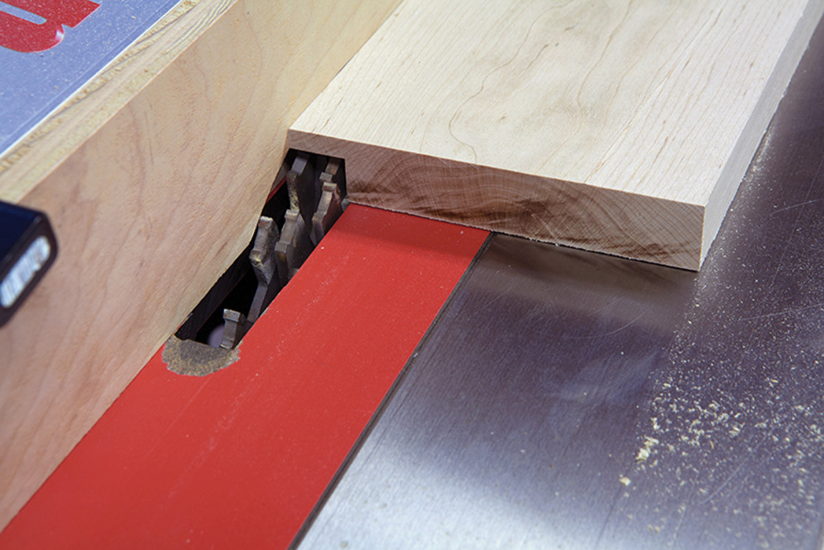 Efficient setup. I decided on 5⁄8″-thick backboards and a 5⁄8″-thick fixed shelf. That allowed me cut both the rabbet for the backboard (above) and the dado for the shelf (below) with one dado stack setup at the table saw. (I used a similar setup later to cut shiplap joints in the backboards.)