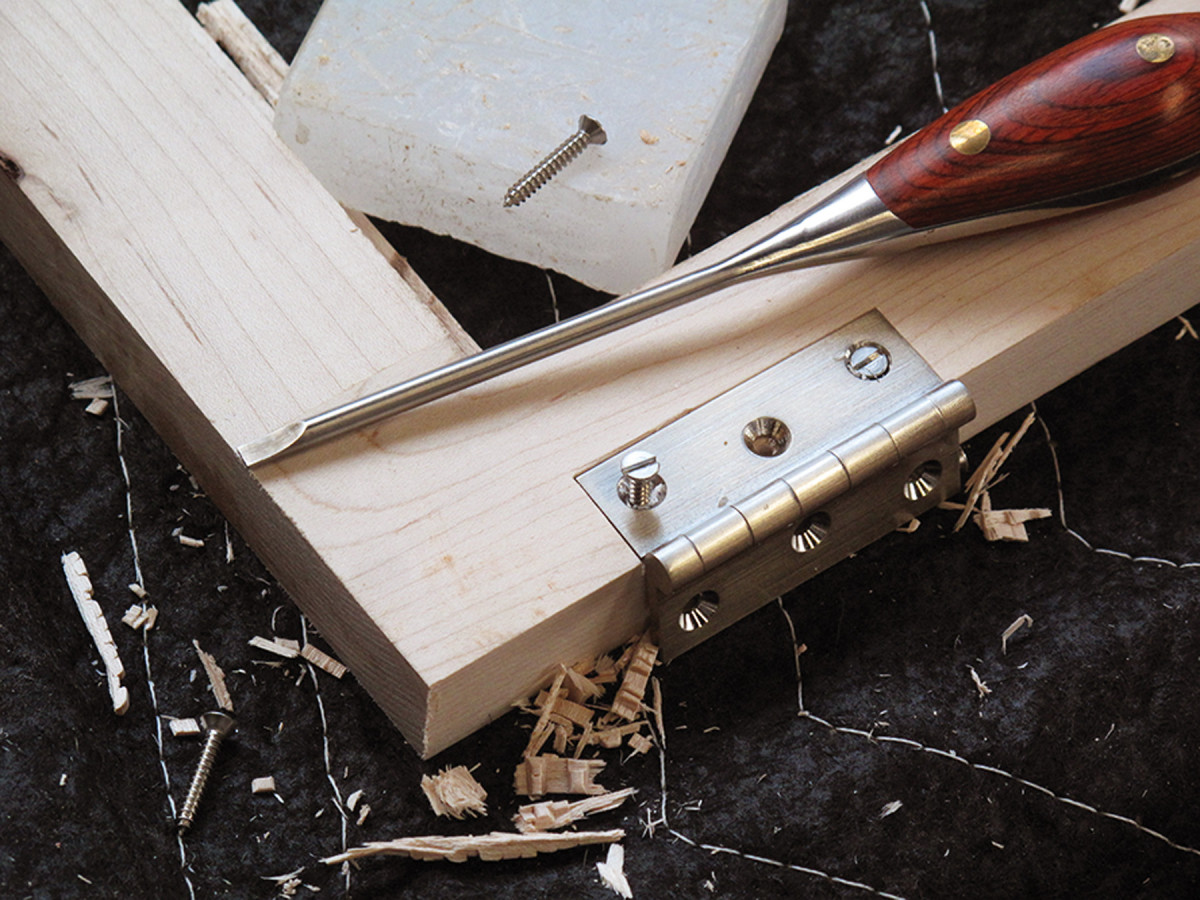 5. Screw holes. Drop the hinge in its mortise and mark the screw-hole locations, then drill. Be careful to not drill through the stile.