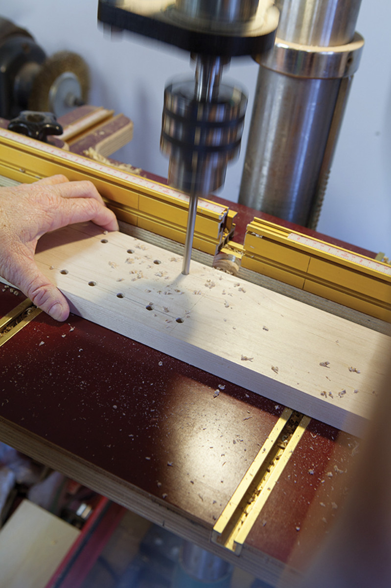 The last task before gluing up the carcase is to lay out and drill shelf-pin holes for an adjustable shelf. I used a pair of dividers to walk off the hole locations about 58” off the front and rabbeted edges; the holes are spaced 1″ on center. I decided (based on the size of some of my toiletries) on five possible shelf locations in the bottom section of the carcase. Your needs may vary.