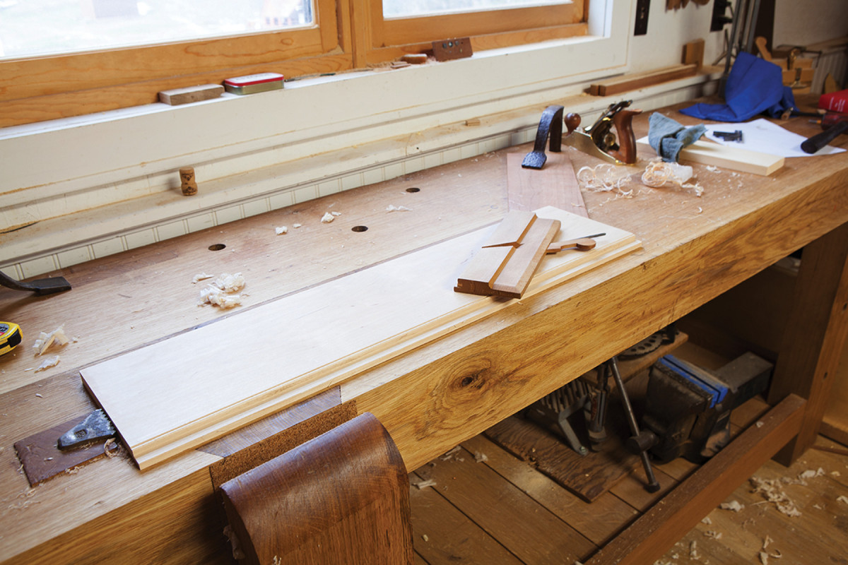 Beaded. After planing the face of the backboards smooth, I cut a 3⁄16″ bead where the shiplap joints meet. Note that the bead is cut on the full 5⁄8″ thickness, not on the rabbeted surface of the mating piece.
