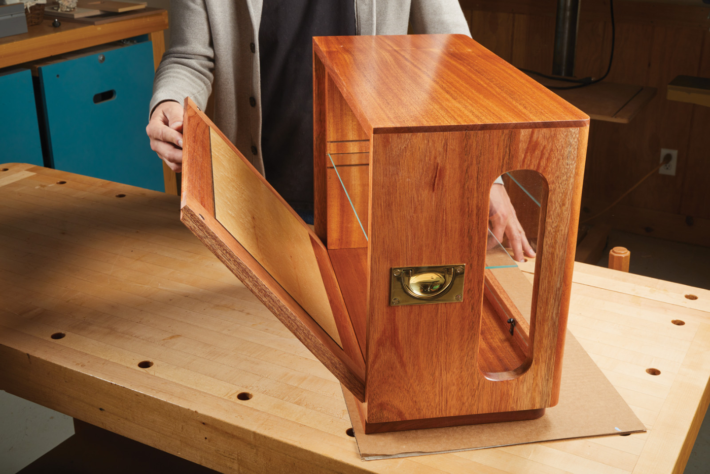 Like the opening on the side panels, a template was used to create the radiused corners on the front panel. After the layout line is established, drill a pilot hole and continue to cut out the shape. Reapply the template and flush-trim the frame using a pattern bit. Swap out the pattern bit for a 1/2“ rabbeting bit. This creates the recess that will house the glass panel. Finish off the cut by squaring up the router corners with a bench chisel, then give the left and right sides of your panel a 3/4“ round-over.