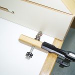 To further secure the back and make the interior of the cabinet accessible, I drilled a couple of 3/8“ diameter recesses on the stiles facing the interior of the cabinet to house rare-earth magnets. The corresponding holes were then drilled on the backside of the shelf sleeves. Follow up by creating a cove on the top side (back of the panel) over at the router table. This detail acts as a finger hold to assist in removing the back.