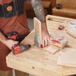 Chuck the 1″ Forstner bit into the drill and set the center point of the bit in position. Drill the hole to a depth of 1⁄2” while remaining parallel to the rail and square to the leg.