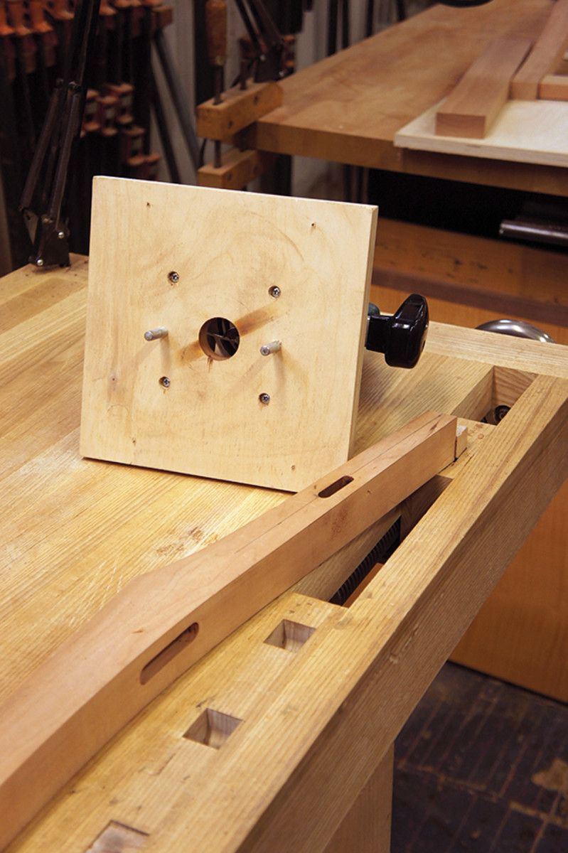 The vertical face is hinged to allow for the angled mortises we need on this chair. You can screw a wedge with the angle determined through your full-scale drawing behind the vertical face to directly transfer that angle to the jig.