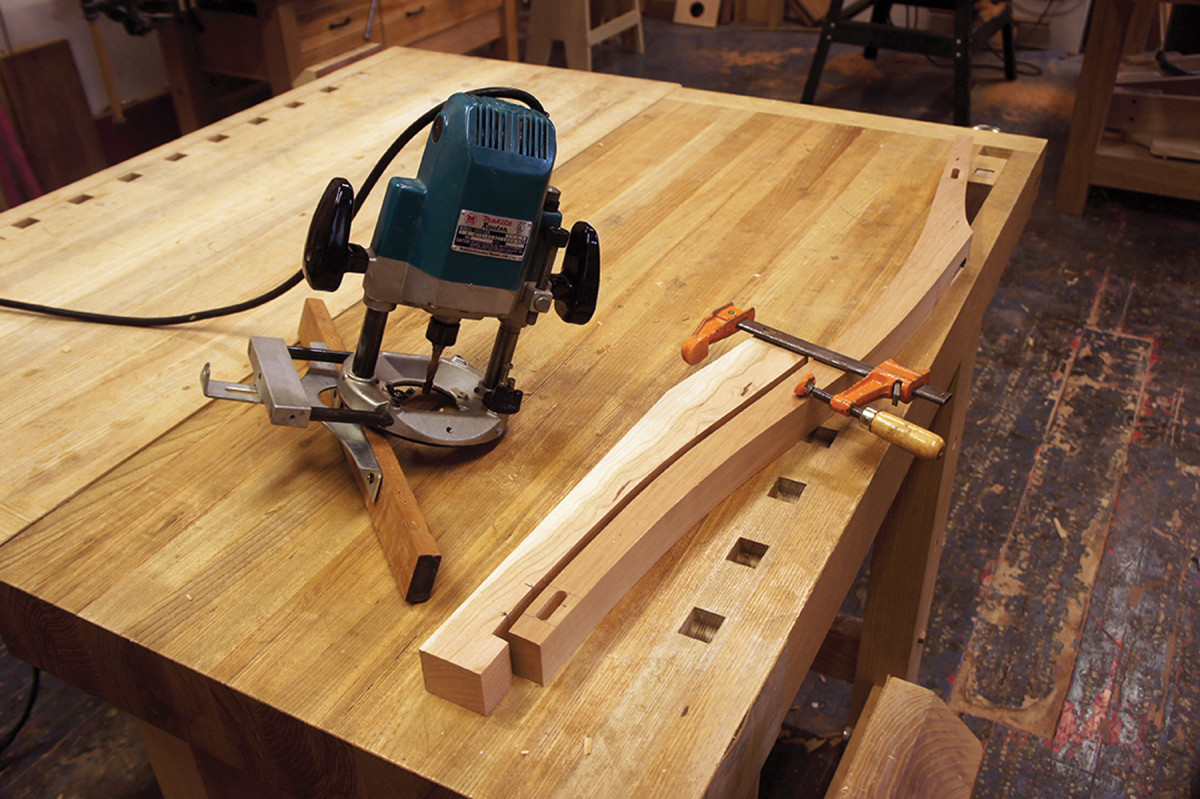 Seat recess. A trim router with a 1⁄4″ straight bit makes quick work of the bulk of seat recess waste atop the legs.