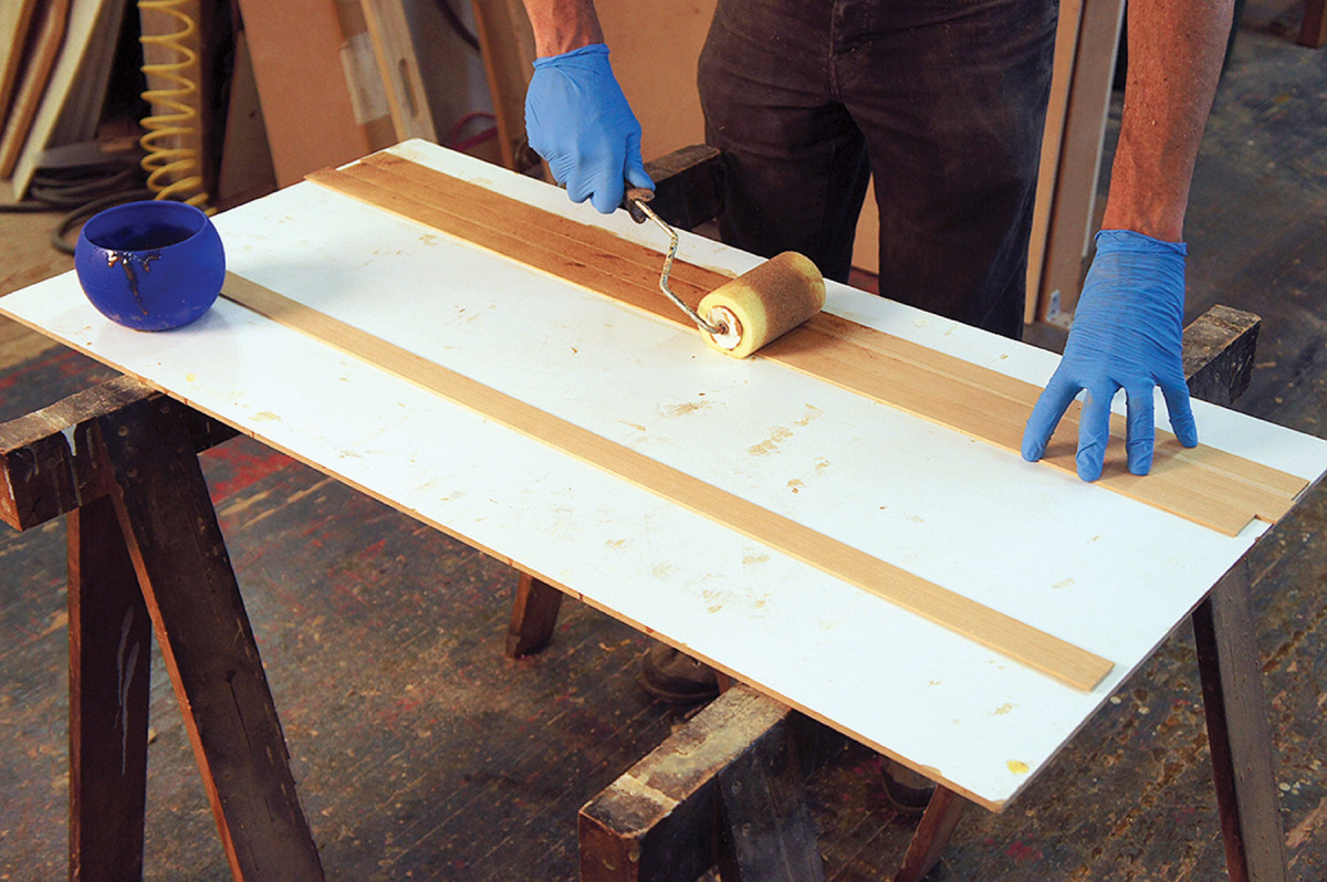 I use plastic resin glue when I have laminations of this sort to do. The glue forms a very hard and rigid bond that allows for little, if any, spring-back. Mix up the glue according to the directions, and spread it on three of the strips using a foam paint roller.