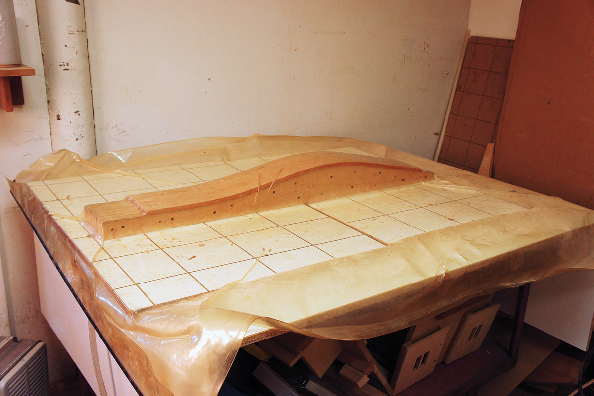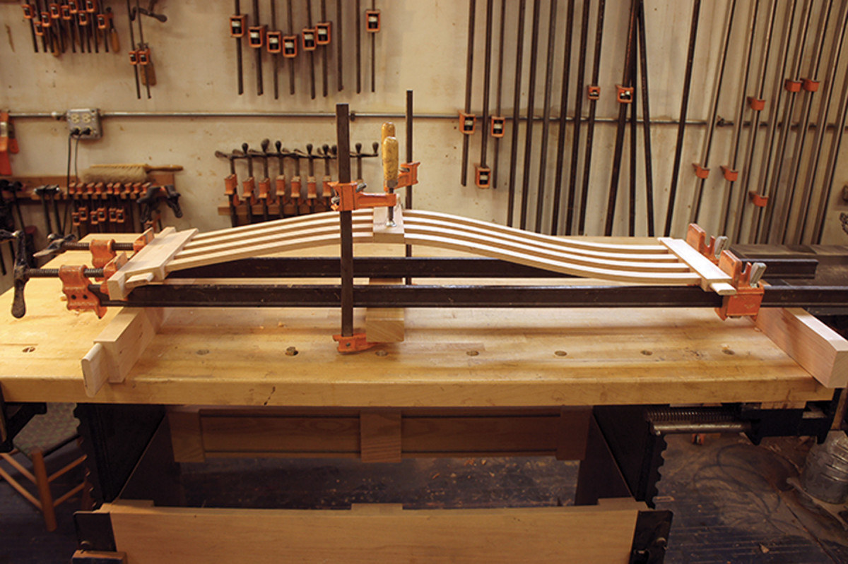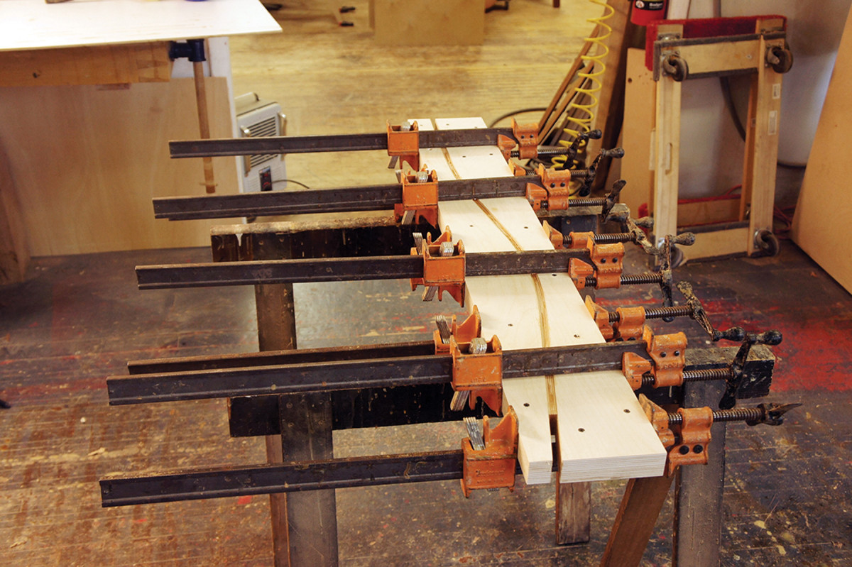 Pressed into shape. The bending form and caul capture the laminations as the glue dries. Place clamps alternating top and bottom every 6″, then let the glue dry for at least 12 hours.