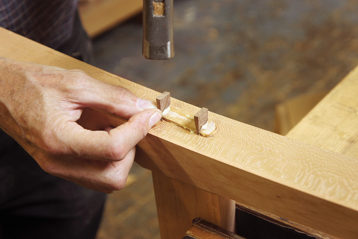 Wait a minute for the glue to tack up, and then remove the clamps and clamp the rail in a vise. Spread some glue on your wedges and carefully tap them in until they are fully seated.
