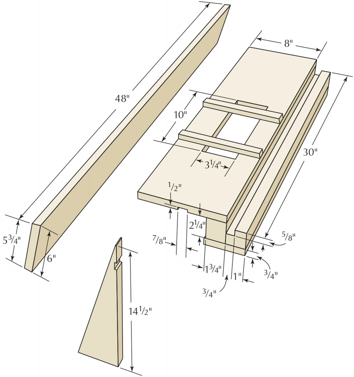 Cut the beveled ends of the seat-back rail on the table saw, either using a wedge (the same one from the mortising jig) or by angling the blade. Check the fit carefully, then drill pocket holes on the inside face of the rail for attaching to the side rails. There’s no need to install this rail now.