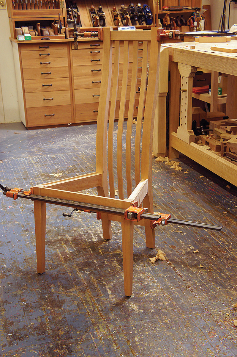 The final assembly requires only three clamps: one for the clamping the front legs to the front rail, and one each across the back legs at the crest rail and lower back rail. Spread glue in the mortises and lightly on the tenons, put the chair together and clamp. Leave the chair in clamps to dry fully.