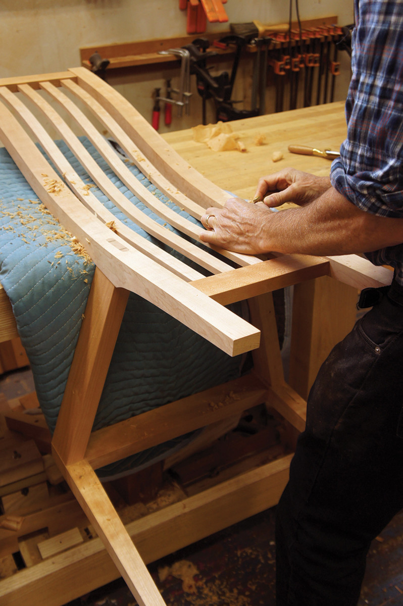 You’ll need to insert the lower back and crest rails into one of the legs to determine the overall length for the slats. They should fit to the bottom of the mortises. Be sure that each of the slats is cut in the same way so the shapes match when installed; it can be confusing because the curve is not quite symmetrical.