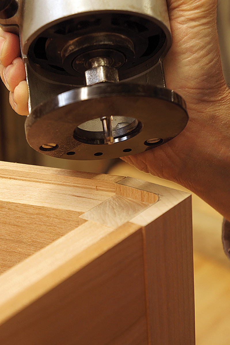 Now plunge rout the mortise in very small increments, no more than 1⁄16” at a time. This will keep the router from overworking and vibrating excessively, which would give you a larger mortise.