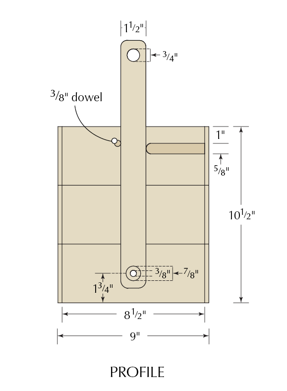 Now, while the glue for the spring latches and stops is drying, make the main handle. This handle is mounted to the lowest tray by a nut and bolt through the arm and into the tray. The two arms of the handles on either side are connected by a 3⁄4” dowel above the stacking trays.