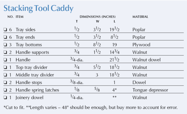 I designed this stacking tool caddy to hold small parts and a few tools. It’s comprised of three tool trays that stack and interlock together to form a single unit that can be carried wherever needed. Best of all, it stores my screws, nails and small tools so they’re all right at hand. It’s also handy for transporting other items: sewing supplies, fishing tackle, and whatever else you can think up.