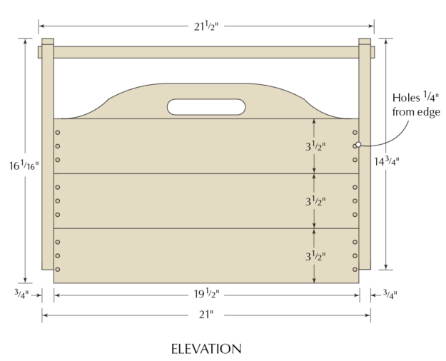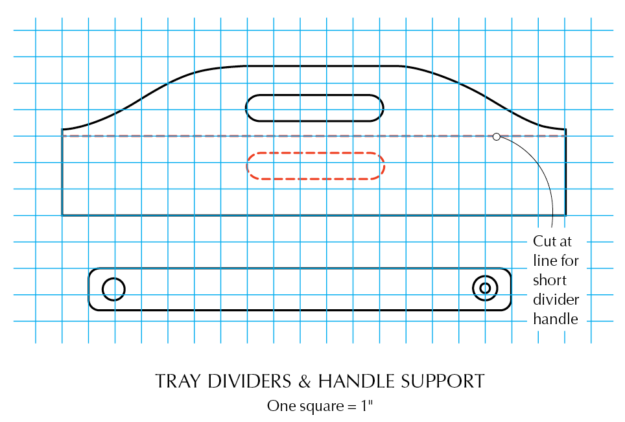 The top divider has a tall handle, and the middle divider has a low handle that sits below its walls. From the drawing below, make full-sized templates for the two dividers and trace them onto the wood. Use a jigsaw or other appropriate saw (such as a bowsaw or band saw) to rough out the shape.