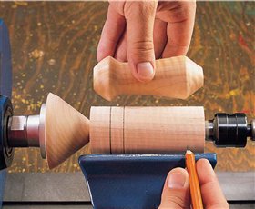 4. Make the handles. Turn one handle holding it between your cone center and a conical live center. If the handle stops spinning while you’re turning, crank the live center into the wood and take lighter passes with the gouge. Use the handle you just turned as a pattern and turn a duplicate. Hold a pencil on the tool rest, as shown, to transfer high and low spots of the shape to the spinning wood.You may want to use your outside calipers to do a more exact sizing of the second handle to the first. Carefully sand both handles. |