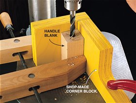 1. Drill axle holes in the blanks for the handles, caps and one end of the barrel using a shop-made corner block. Drilling the holes before turning ensures that the holes will be centered. Clamp the pieces firmly in the corner block to ensure the holes are vertical. Drill holes for the axle clamps and one end of the barrel with a 1/2-in. brad-point bit. It’s crucial that the hole in the large roller is centered and vertical. Use a 14mm brad-point bit or a 9/16-in. spade bit to drill the 4-in.-long axle hole in the |