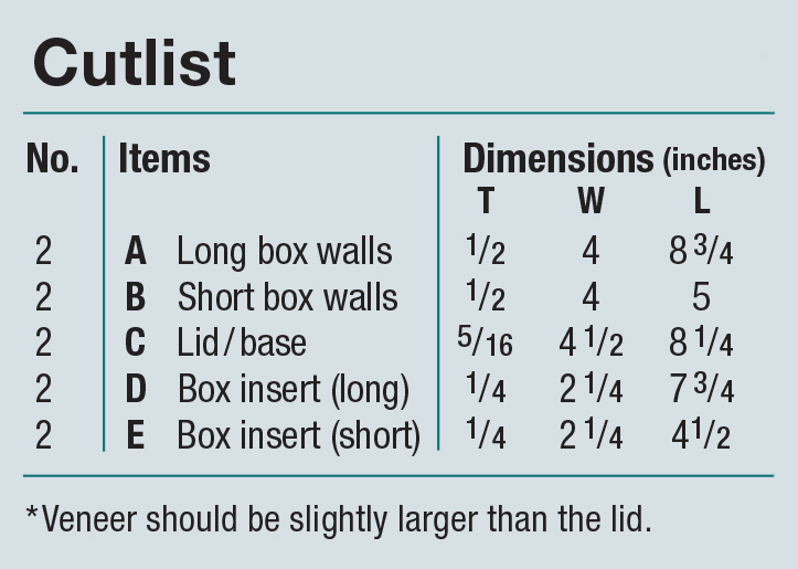 Once the glue is dry, you can use a knife to slice off the excess veneer, then a block plan can flush everything up. Lastly, you’ll rabbet all four sides of the lid so that it’ll fit into our box grooves and leave about a 1/16“ shadow gap. Just be a little careful rabbeting as you’ll want a sharp knicker tool or a good scribe line to prevent any damage to the delicate veneer. You can repeat the process for the bottom, or you can opt out of using veneer and just rabbet the base. Either way, use a piece thicker than the distance of the far groove wall to the bottom of the box so that the box appears to float a little.