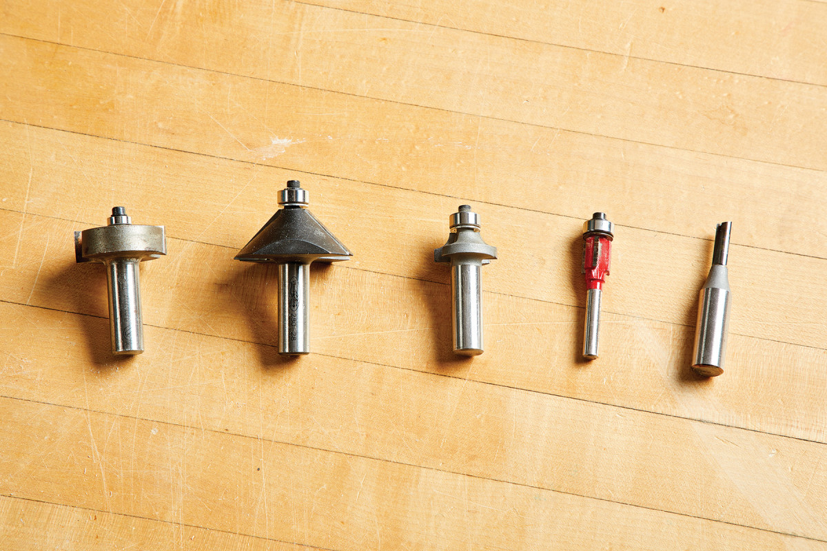 1. Much of the joinery and shaping for this cabinet is cut with a router and these five bits: a rabbeting bit, a chamfer bit, a rounder bit, a pattern bit and a straight bit.