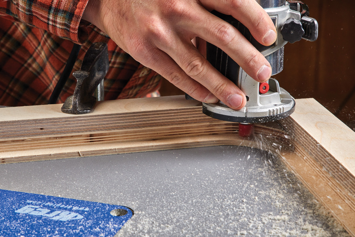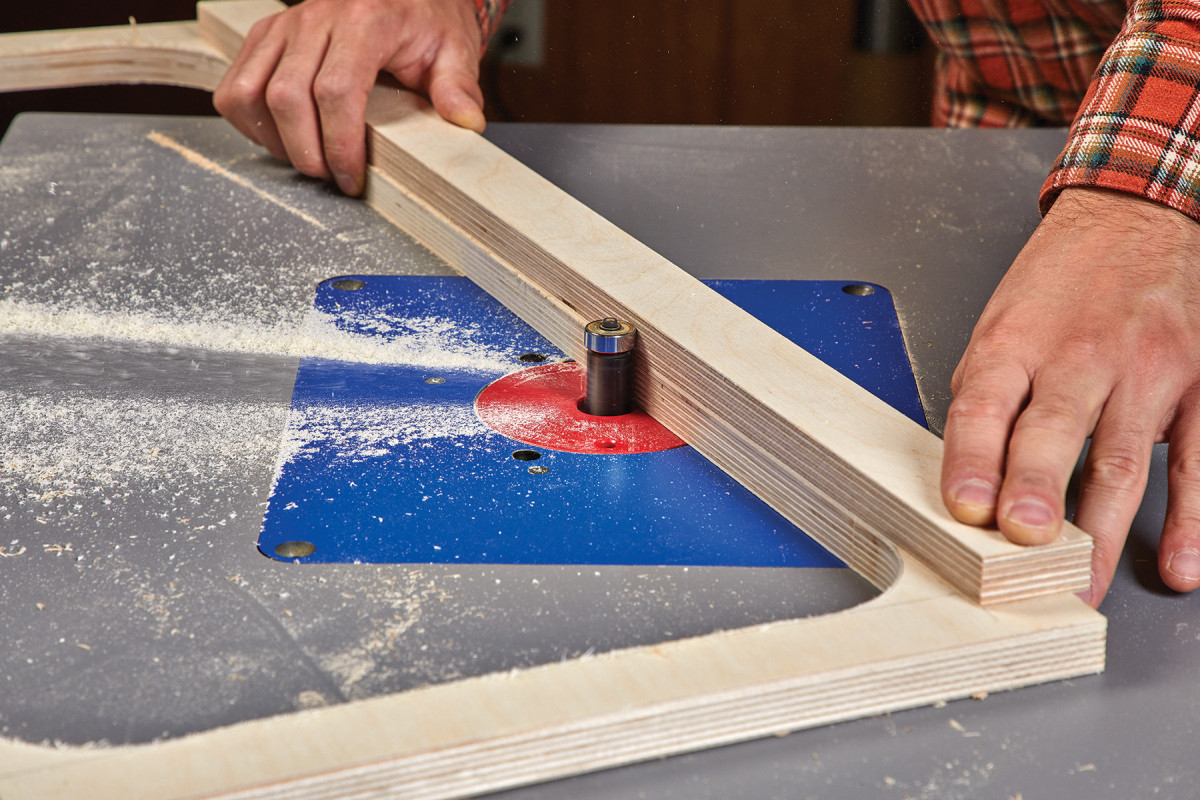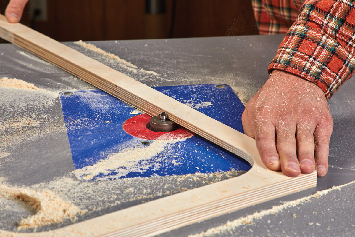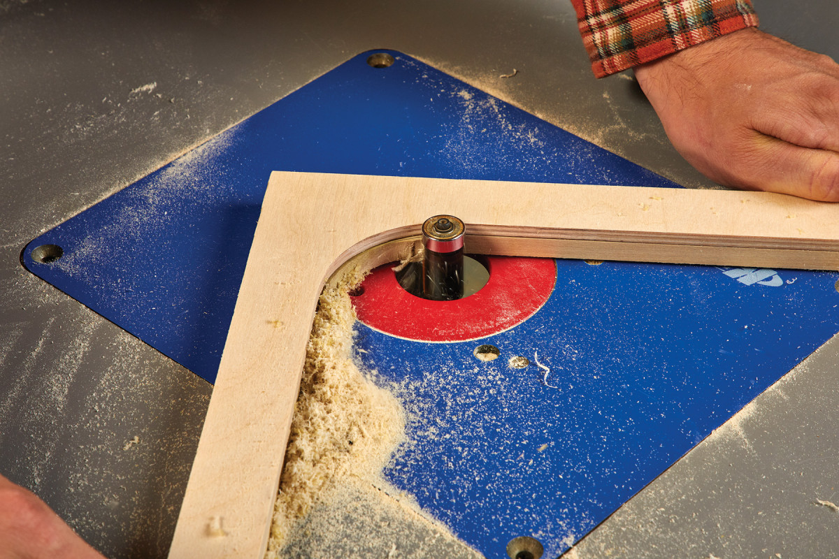 Since the glass retainers are rectangular, the radiused corners will need to be squared up. Switch out the rabbeting bit for a flush trim bit.