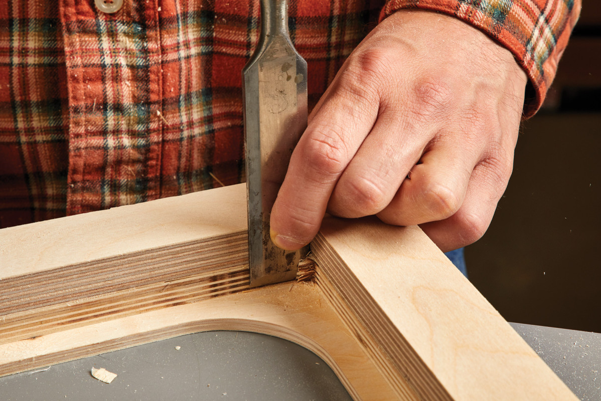 Diameter is mildly arbitrary here, just so long as the bit length accommodates the cut. The technique used here mimics that of the one used to trim up the straightaways on the initial cutouts. Attach a couple of scrap pieces of birch to the work piece to use a template to clean up the corners. A small radius will inevitably remain, so square up the corners using a bench chisel.