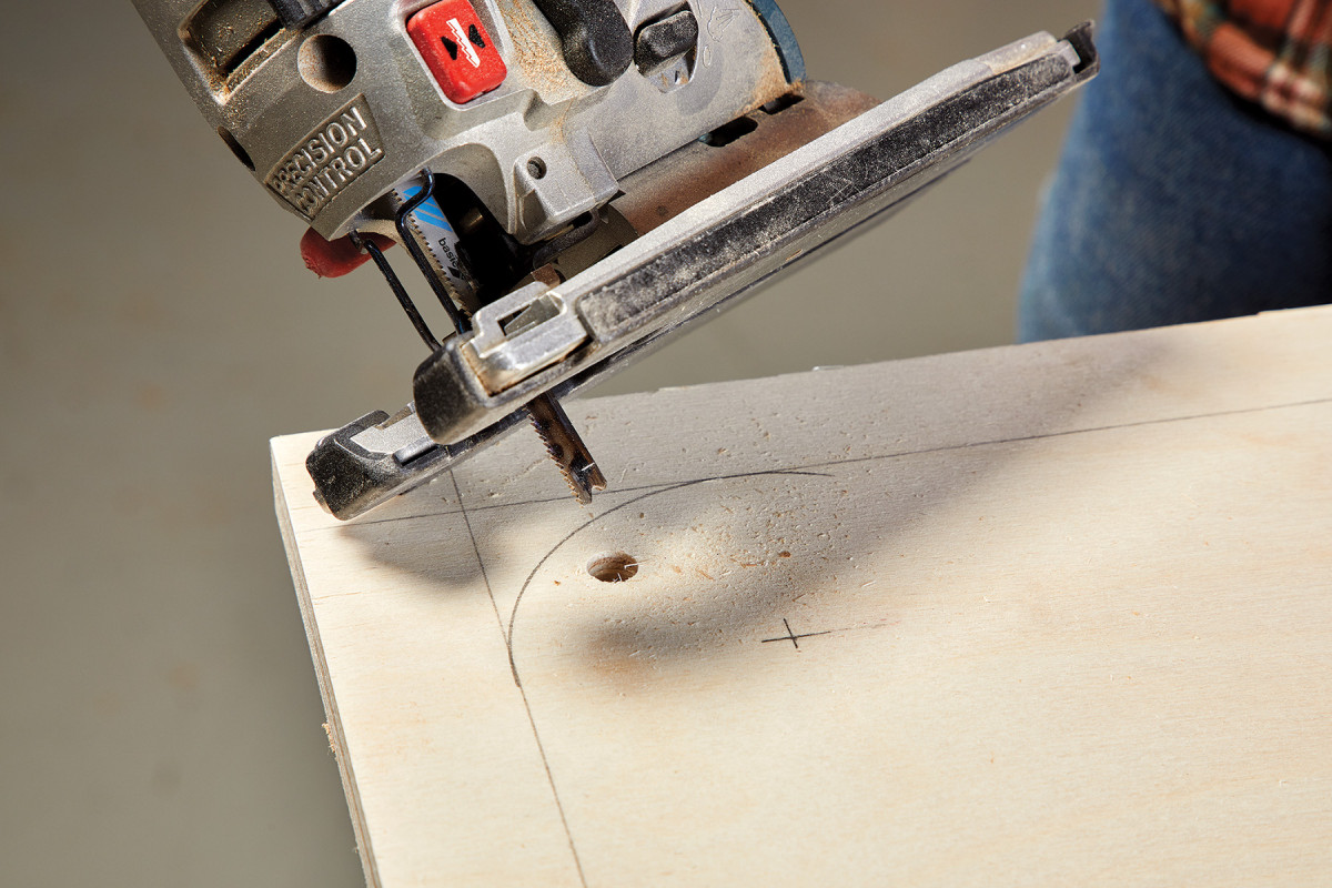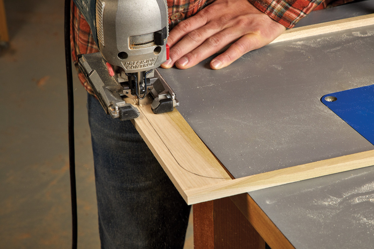 8-9. Drill a starting hole, then use a jig saw to cut out the opening. With the first pass, I cut close to the line, staying inside the cut. Clean up the curves at the spindle sander.
