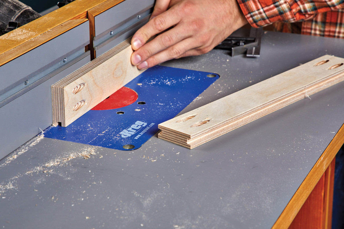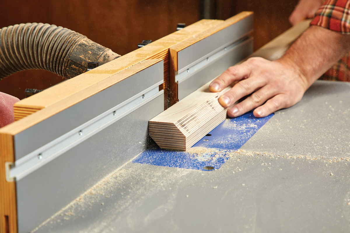 2. Attach two leg pieces back to back with double sided tape, then cut the 45° edge on both, using a bearing-guided chamfer bit.