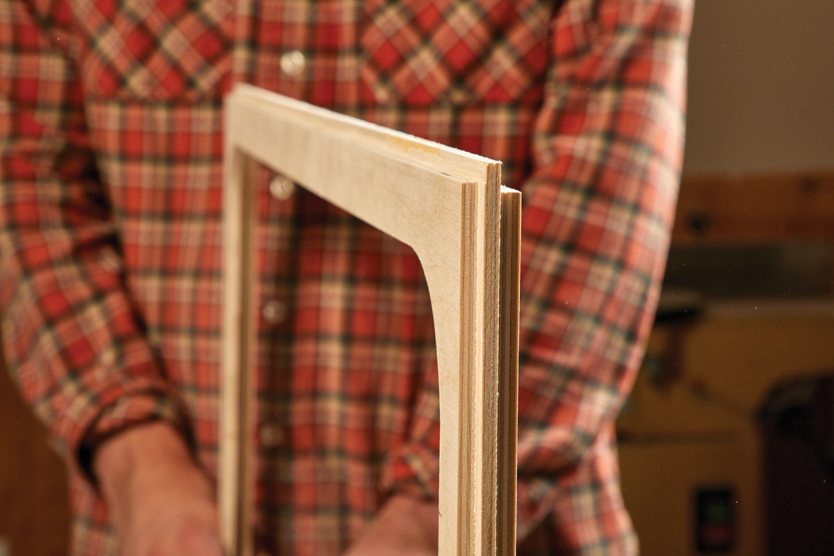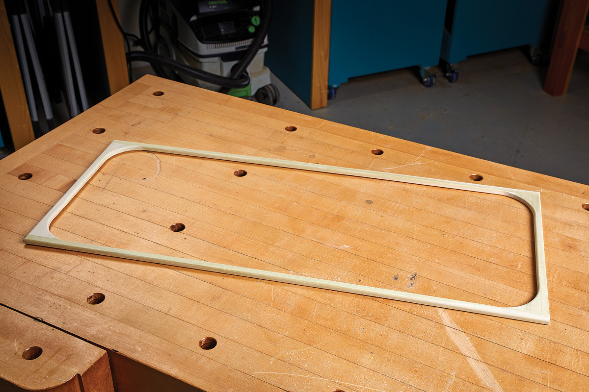 16-17. The glass retainer is solid wood. The stiles are cut to their final dimension before glue up, but the rails are left wide to accommodate the inside radius.
