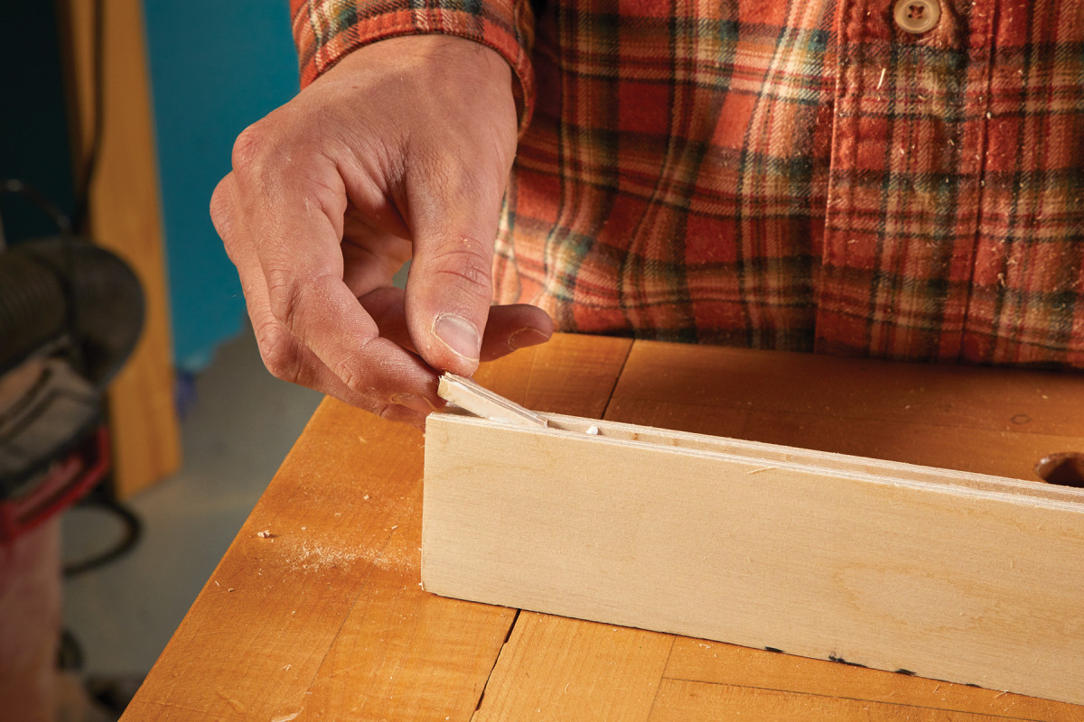26. The rails will have 1/4″ x 1/4″ openings at their tops/bottoms. Glue in some scrap here. Paint will hide any defects.