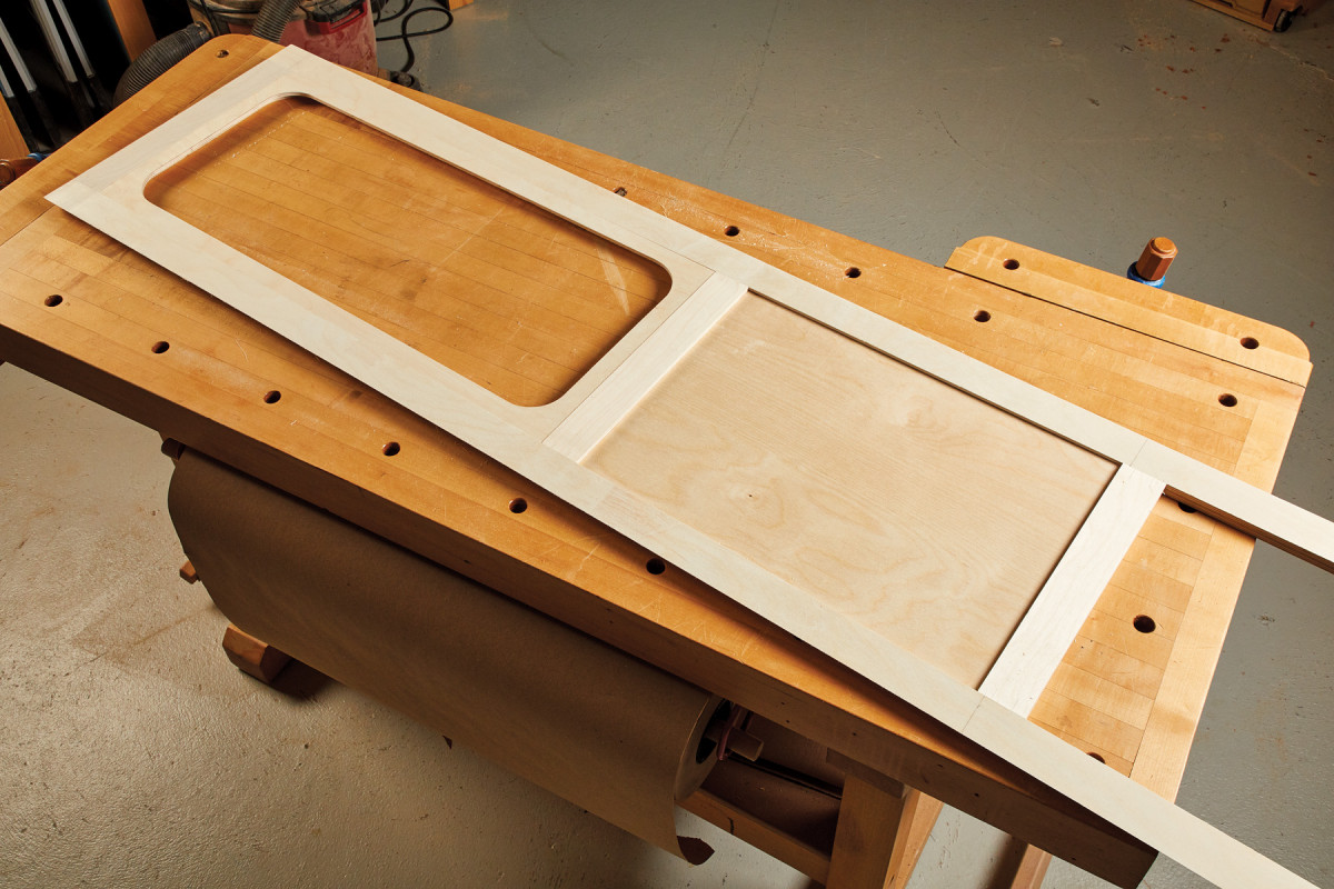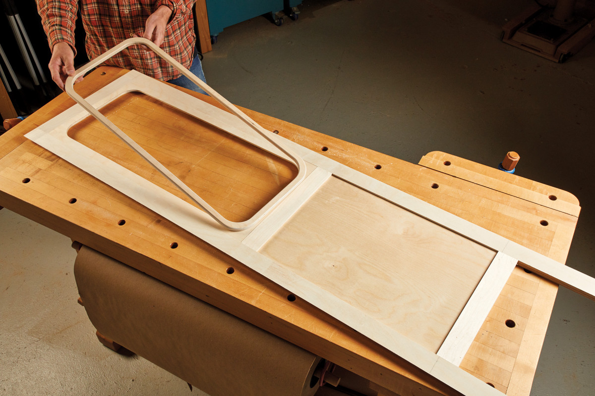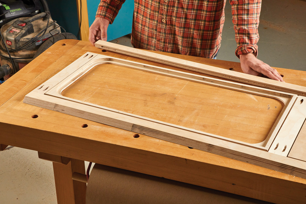 Once these are glued up, place them within the recess and trace the profile of the cutout onto the stile. Remove the excess waste (while the retainer is still within the panel) using a jig saw. Flush trim any remaining waste using the panel as template. Repeat this step for all four panels.