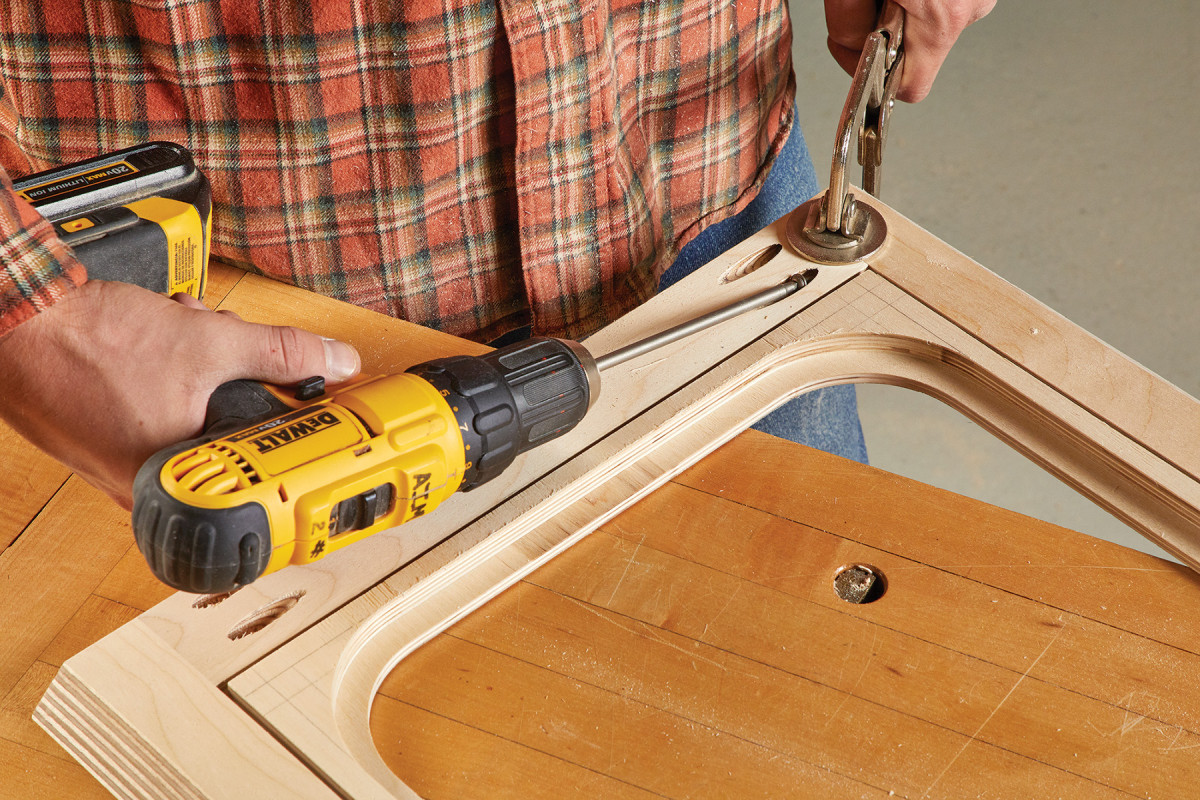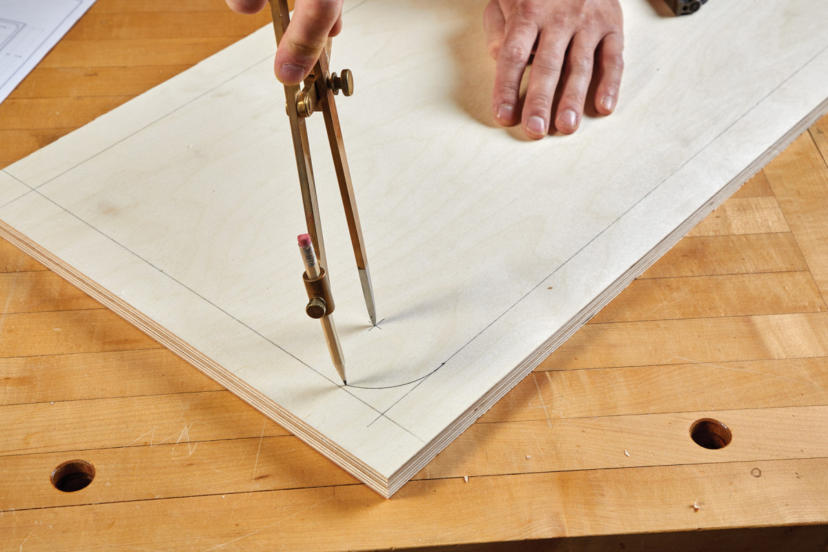 7. The glass doors and side panels are the trickiest part of the build, but they follow the same construction, starting with a piece of 3/4″ plywood. Spend the time to get this part right. Begin with the layout, using a compass to draw the inside radius in each corner of the opening.