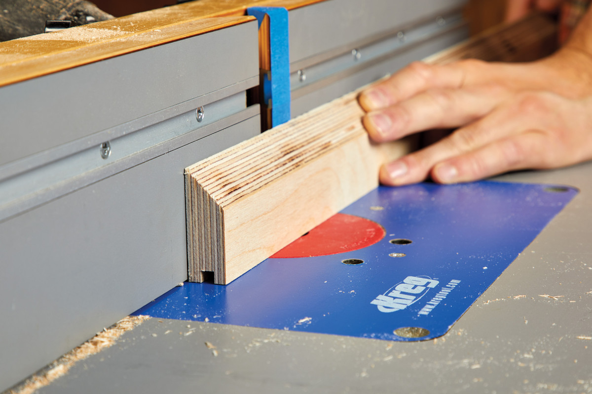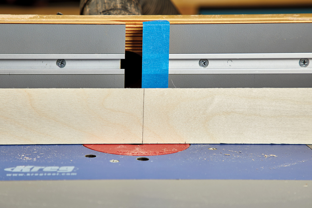 6. To cut stopped grooves, I mark the fence of the router table with a piece of tape, measure the offset from the router bit, and mark my pieces accordingly.