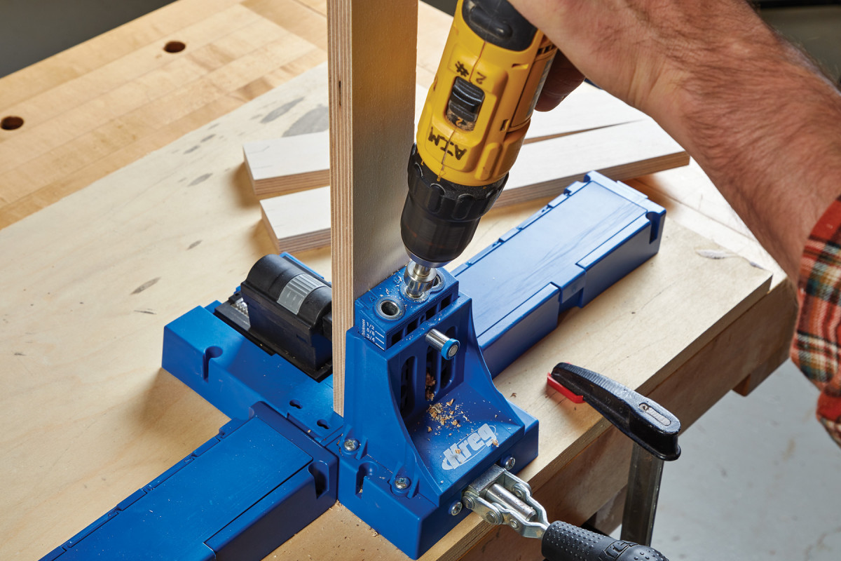 Set the appropriate depth stop on both the pocket hole jig as well as on the bit collet and begin drilling. Repeat this step on all horizontal stretchers along with the two front vertical stretchers that divide the doors.