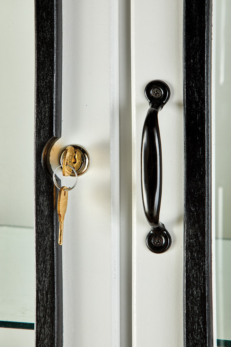 Now that the paint is fully cured, begin by applying the faux gaskets to the four panels. This was done using PVA glue with a series of spring clamps. On the inside of the panels, place the 1/8“ glass (remember to undersize glass dimensions by 1/8“ on each side) and pin nail the retainers in place. Since the shelves have the potential of holding objects of mass, opt for 1/4“ Tempered glass. Finish by installing the shelf pin sleeves, shelf pins, locks, handles, as well as door hinges.