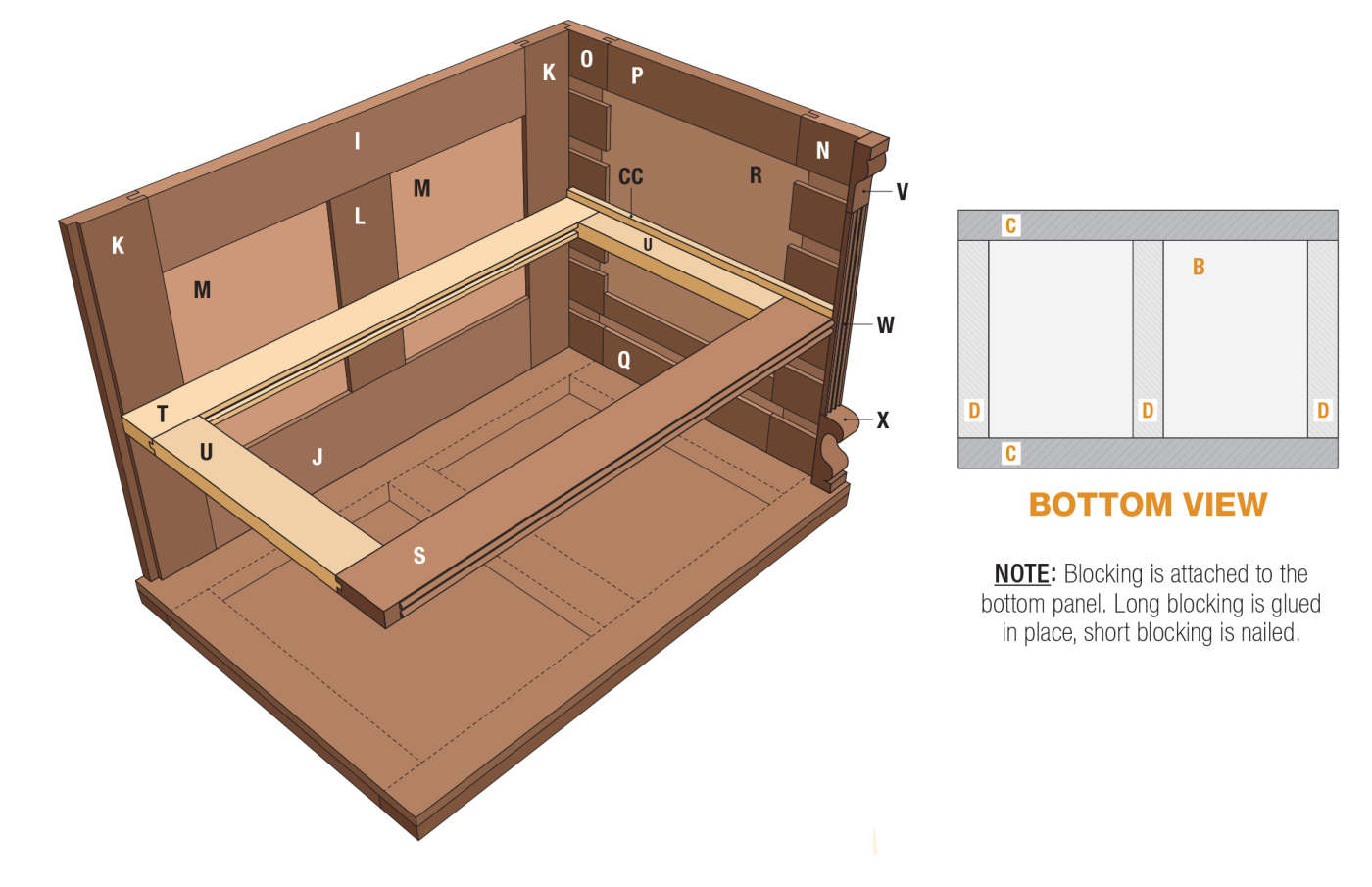 Now, laying the case onto its back, I added some blocking to the bottom. This increases the thickness of the bottom. No glue here— we want to allow the wood to move as it will, so I simply nailed these in place. Remember that nails will flex and move. Screws will not.