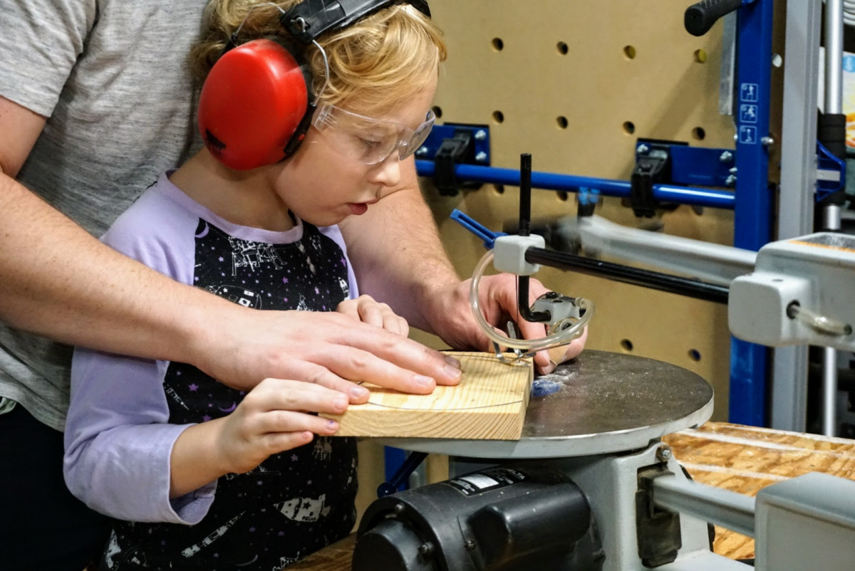 Part of Oliver’s reluctance has been a strong dislike of loud noises. Getting him set up with some good ear protection and being careful with the tools I chose helped overcome his previous issues. I also only had him do things he was comfortable doing- there’s a time and place to push new skills, but right now the focus was on just getting started. I picked the scroll saw because it’s a great beginner’s tool; it’s not particularly intimidating and the chances of injury are (relatively) low. Plus it’s a tool that he can grow with and we can use on subsequent projects, like a snowman during the winter holiday season.