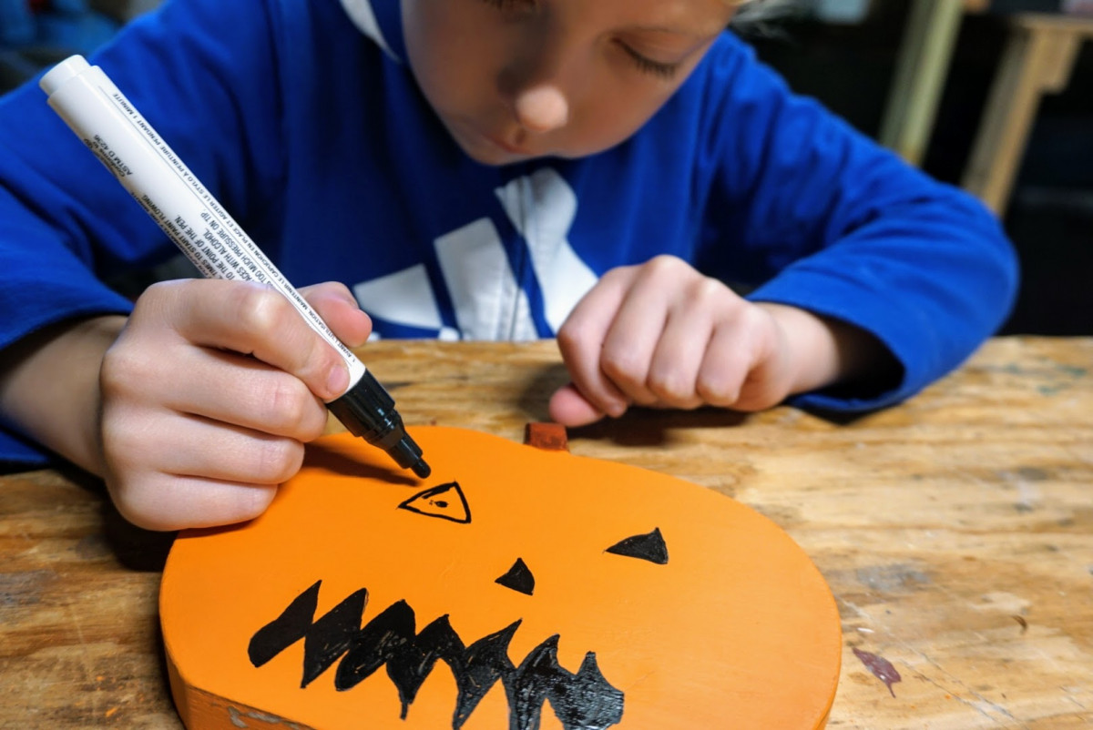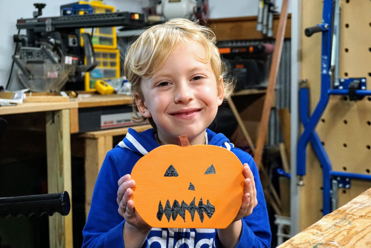 My son Oliver has been fascinated by my woodworking projects for years now, but has always been resistant to the idea of building anything of his own. I decided to take advantage of his love of Halloween to come up with a basic idea he could make almost entirely by himself: a pumpkin.