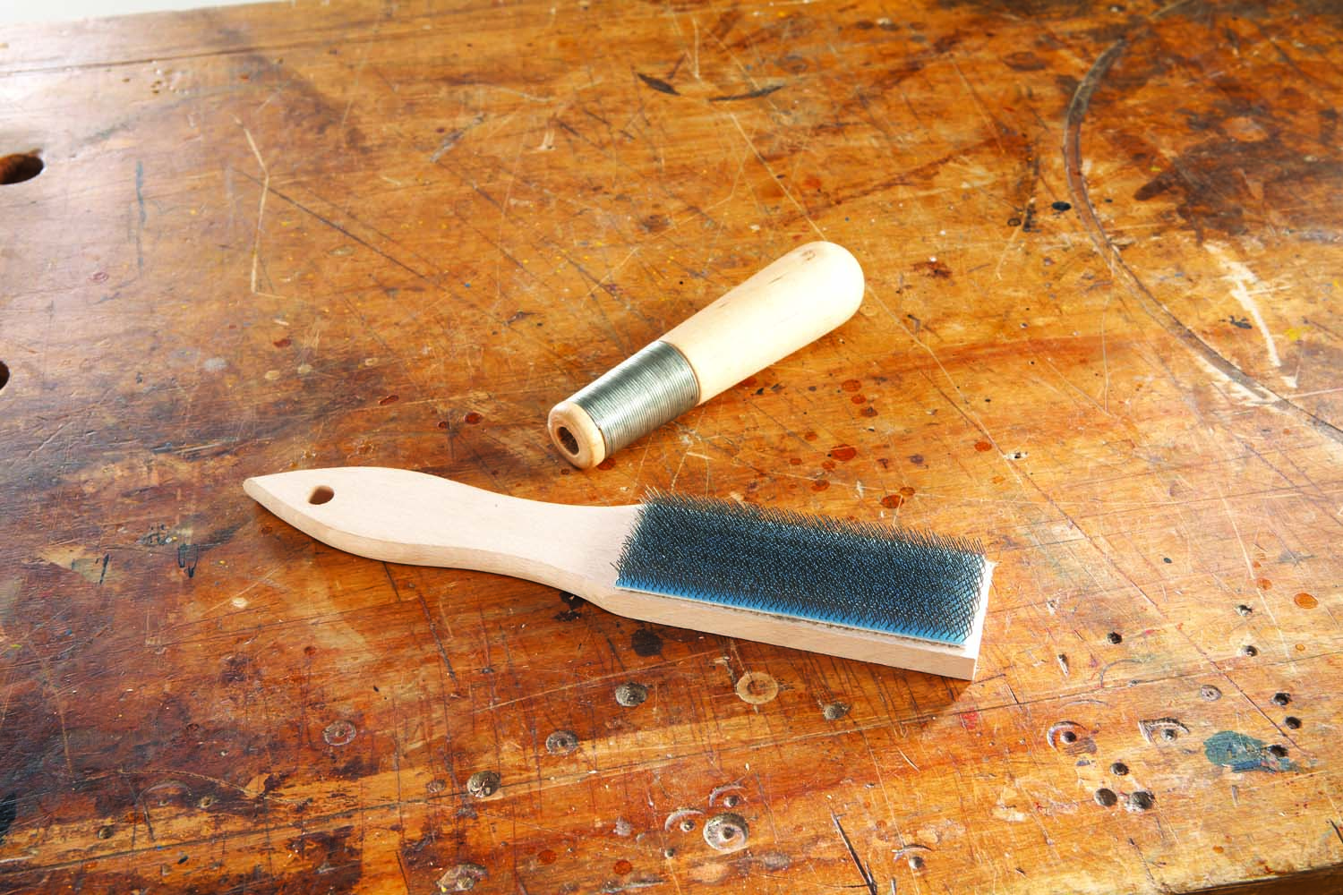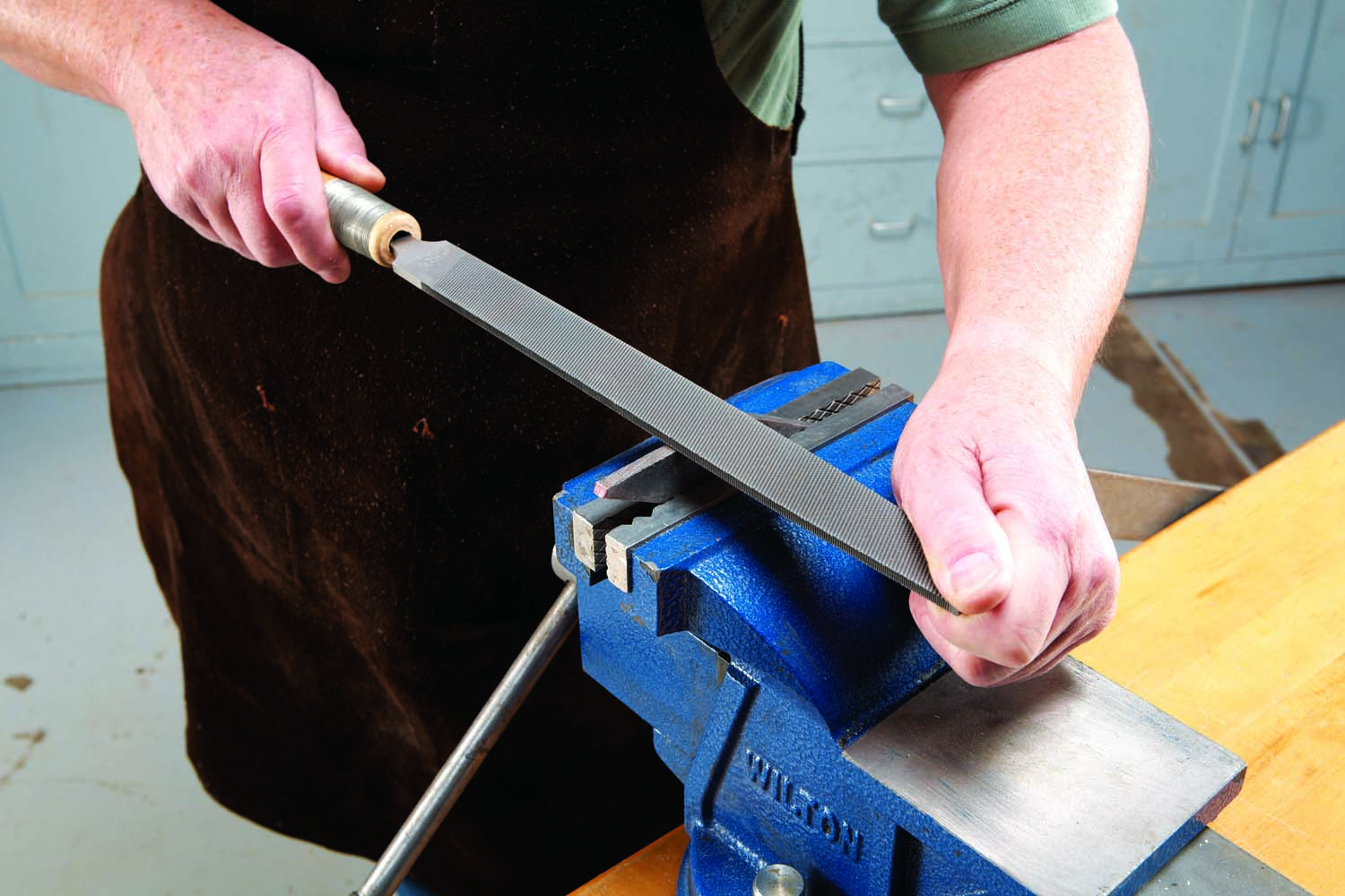 A set of files is incomplete without two additional items: a file card and a handle. The file card is basically a stiff wire brush. Use it to clean a file’s teeth after every few strokes. You’ll quickly find that a clean file works much more efficiently than one clogged up with metal waste.