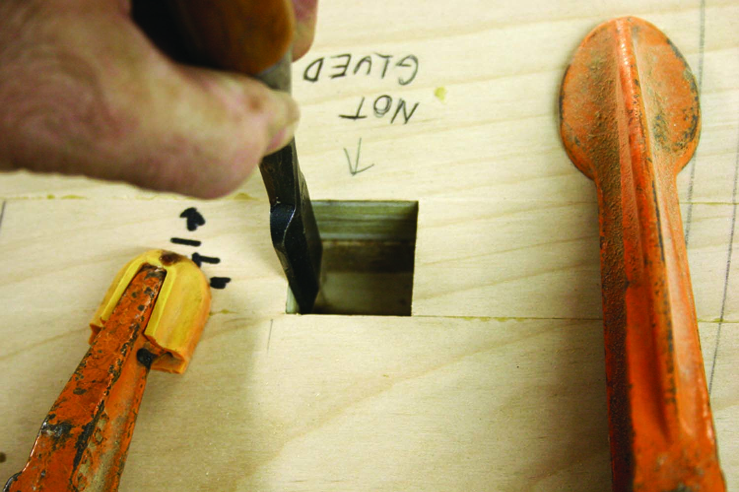 Before you take the top off, mark a corner so the top goes back in the same orientation as it was when marked. Use a mortise machine or a Forstner bit in a drill press to hog out the waste between the marks, staying about 1⁄32” or 1⁄16” to the inside. If you use drill bits to hog it out, go ahead and chisel out the mortise within 1⁄16” of the inside of your marks.